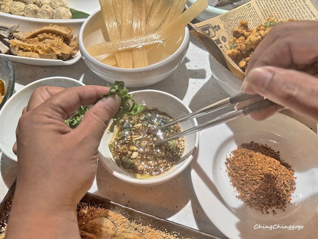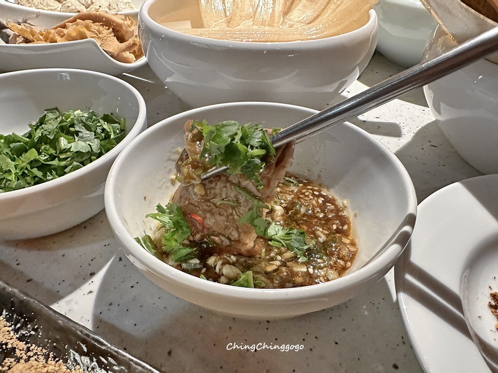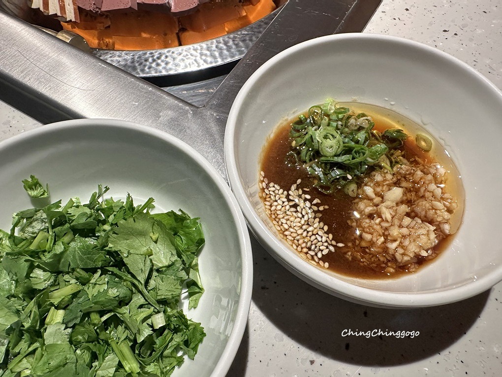 🧄招牌沾醬:吃鍋前服務人員會端給每個人一碗招牌沾醬,滿滿的蒜末、蔥花、白芝麻、蠔油攪拌攪拌混再一起,再加喜歡的香菜量,晴晴兒有測試過,先單吃麻辣鍋辣度比較明顯,但沾醬吃入嘴中卻有緩緩解辣的感覺。