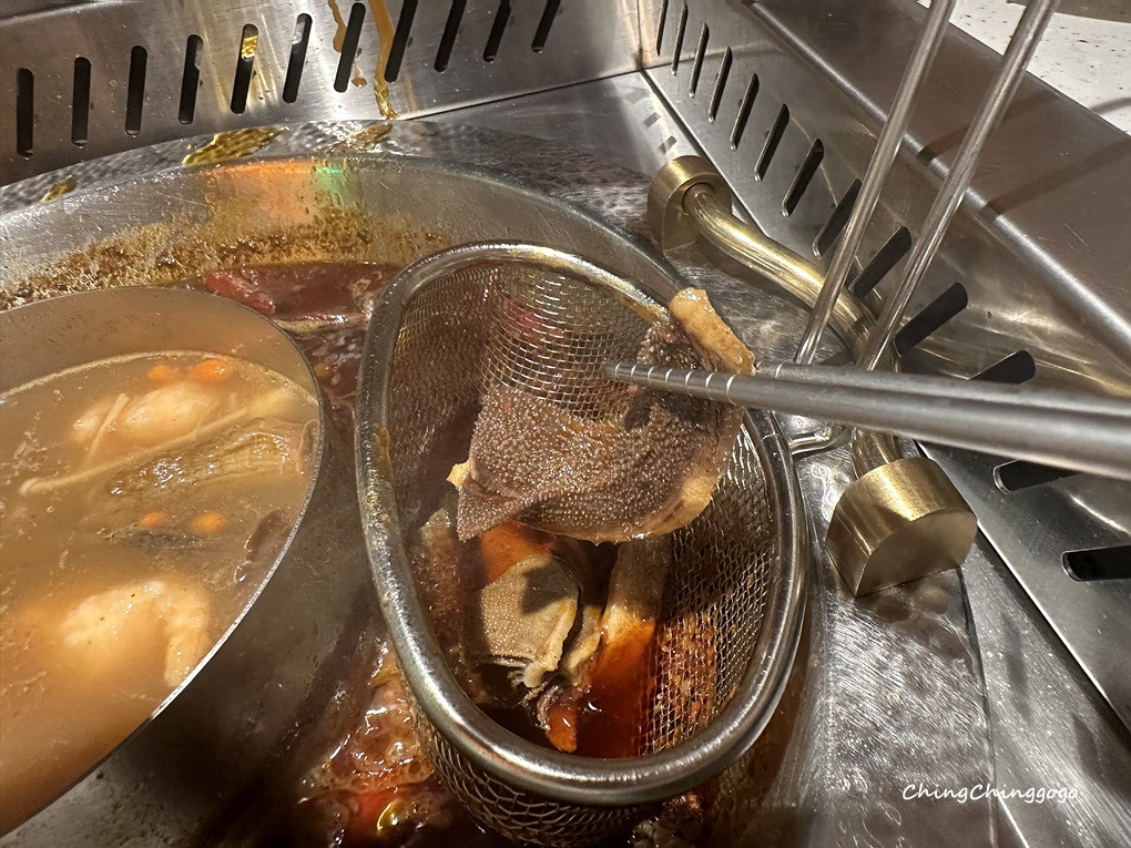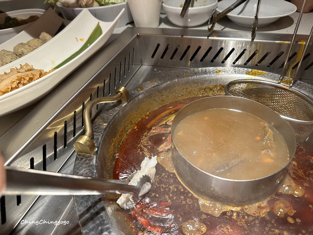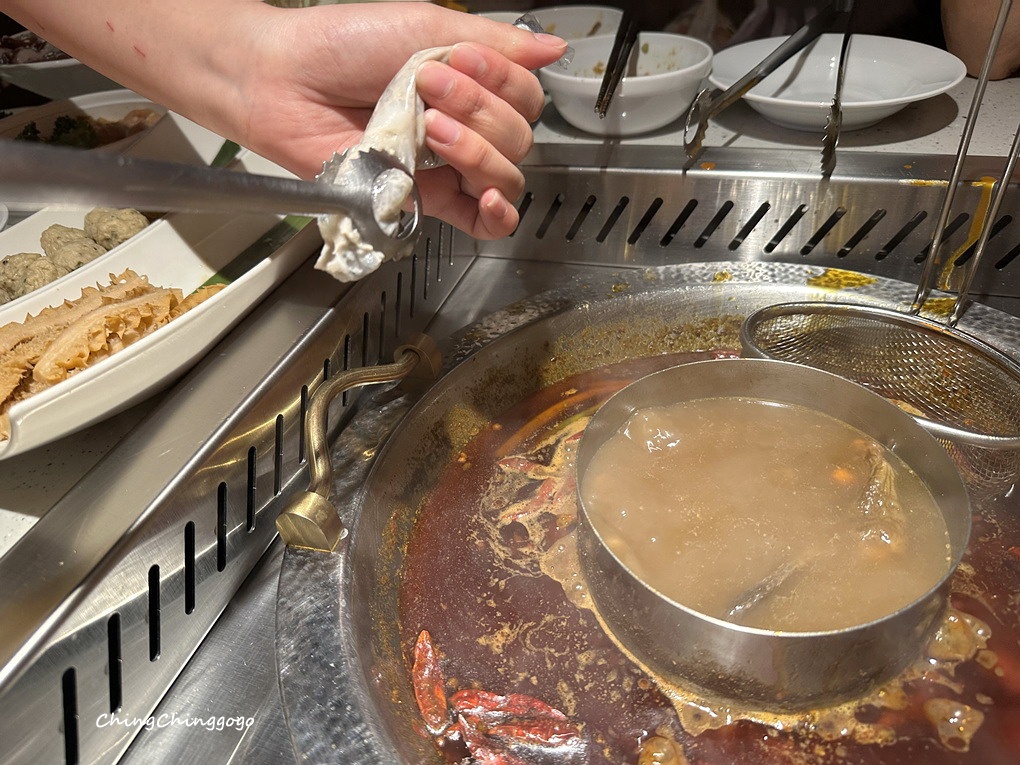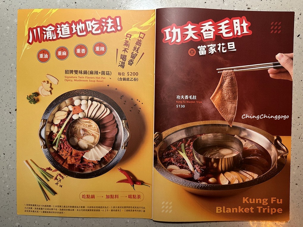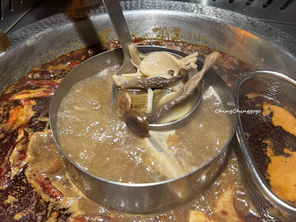 招牌雙味鍋(麻辣+菌菇),麻辣鍋底只涮不喝湯,正宗重慶火鍋靈魂精隨,食材吸附滿滿湯底精華,香麻夠勁但不死鹹,涮肉後沾上招牌沾醬竟然有解辣感!熱騰騰的菌菇鍋,湯頭清澈卻蘊含層層濃郁香氣,採用各式各樣多種菌菇在鍋中交織,湯汁入口溫潤迷人,從牛豬肉片、牛三寶、功夫香毛肚、QQ川粉、手工蝦滑、海鮮盛合到爽脆時蔬,通通都能襯托湯底風味。