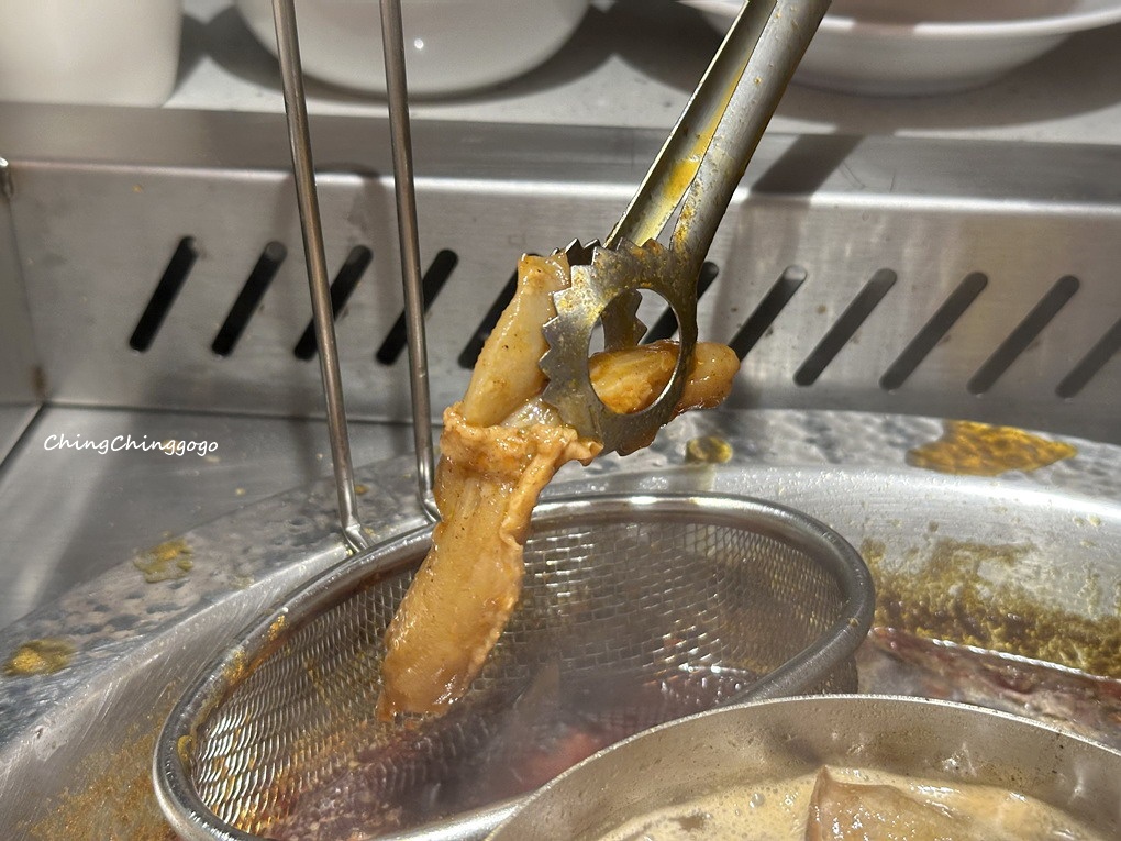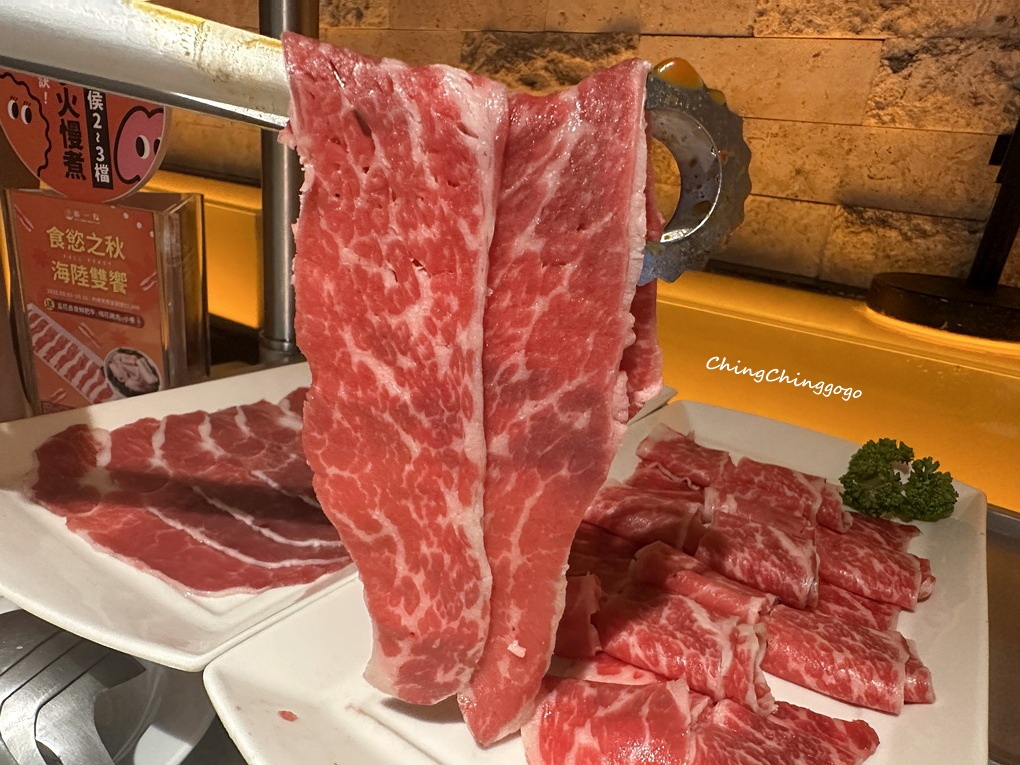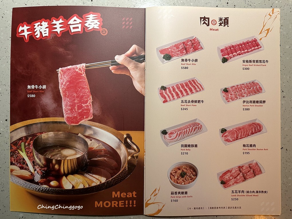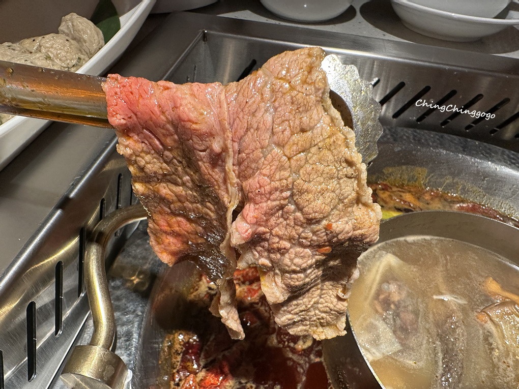 🔻無骨牛小排 (580元),輕輕涮到粉嫩色澤,吃入嘴中是麻辣湯底的香氣撲鼻,帶著花椒清麻與辣椒的熱勁,肉片柔嫩細緻,油脂在口中化開的瞬間,濃厚的牛香被麻辣湯汁緊緊鎖住,鮮、香、辣、麻一同爆開,咀嚼間既能感受到肉質的滑嫩與彈性,又有舌尖微微顫動的麻感延續,後韻帶著溫潤的辣香,讓人吃得過癮又滿足!