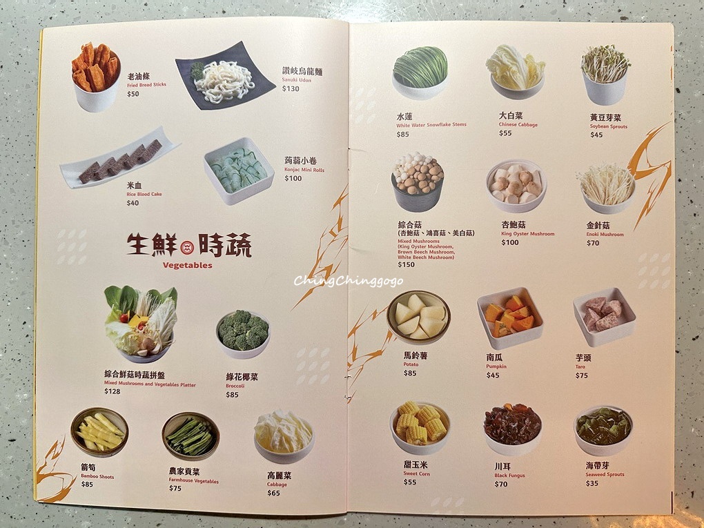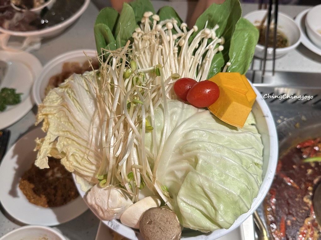 🔻綜合鮮菇時蔬拼盤 (128元),下鍋後吸滿湯底的精華,每一口都展現出截然不同的層次,鮮菇類入口水嫩飽滿,咬下去釋放出特有的菇香和清甜,搭配麻辣鍋時,外層帶香麻辣韻,果然依然保有鮮爽多汁,放清爽的湯底顯得鮮甜,綠葉菜燙過柔嫩爽口,最後吃蔬菜營養又解膩。