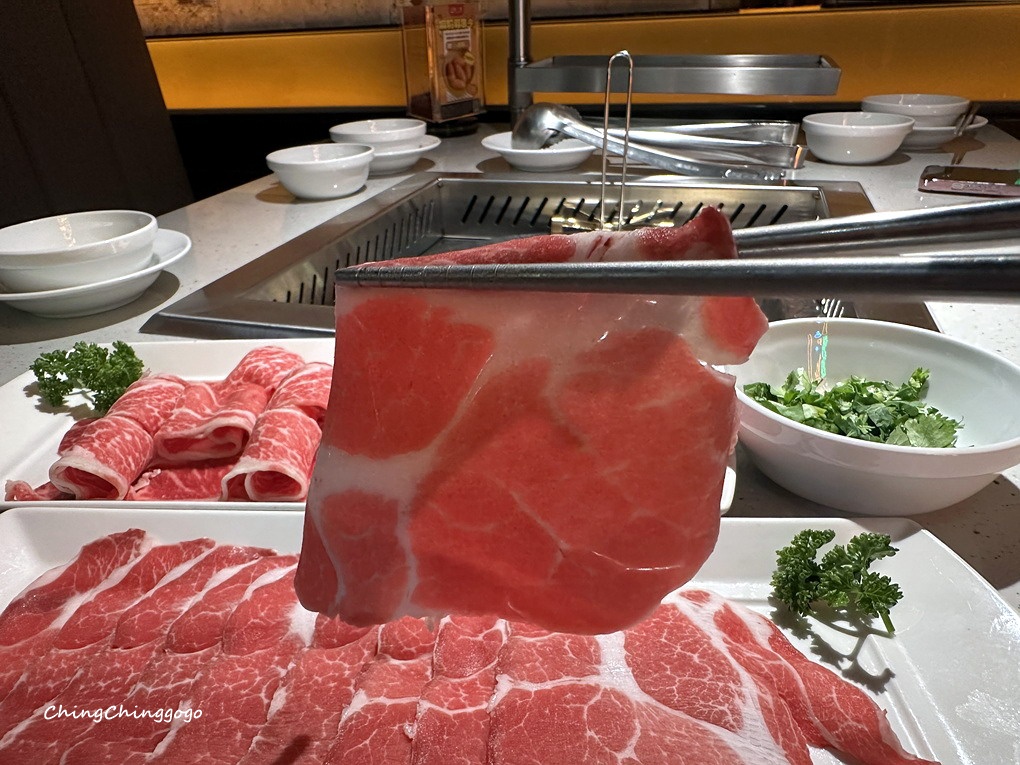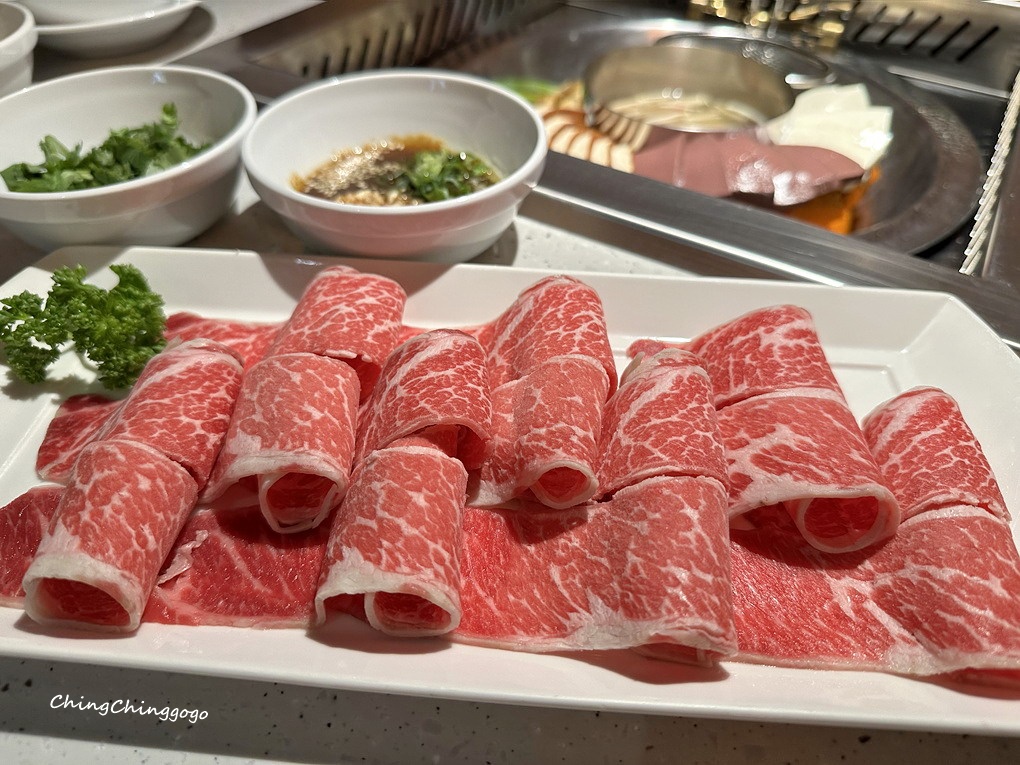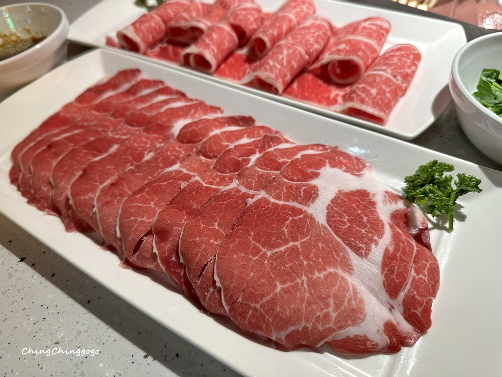 🔻伊比利豬嫩肩胛 (380元),嫩肩胛肉片涮過麻辣鍋後,吃入嘴中是滑嫩柔潤,油脂均勻卻不厚重,帶著自然的堅果香氣,咀嚼的時肉質其中的細緻帶點彈性,越嚼越能感受到豐富的肉香與甜味,隨之而來的是花椒清麻在舌尖交織輕輕跳動,微辣中帶著肉汁的甘醇,很快一盤肉就掃光了。