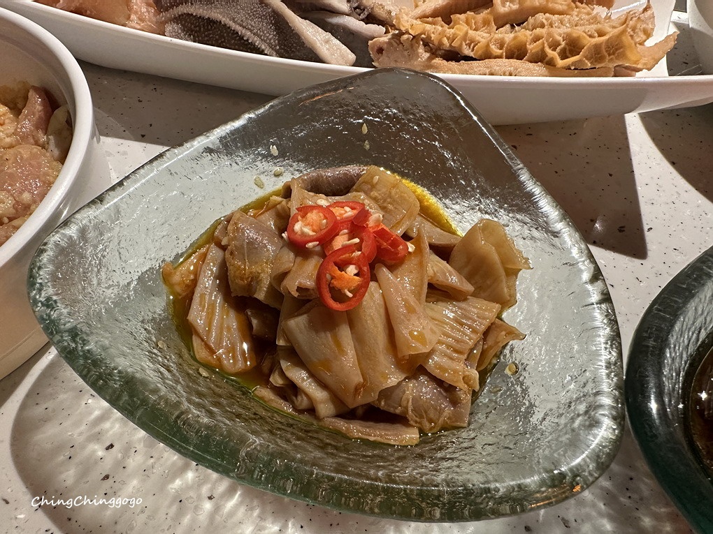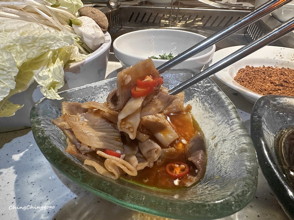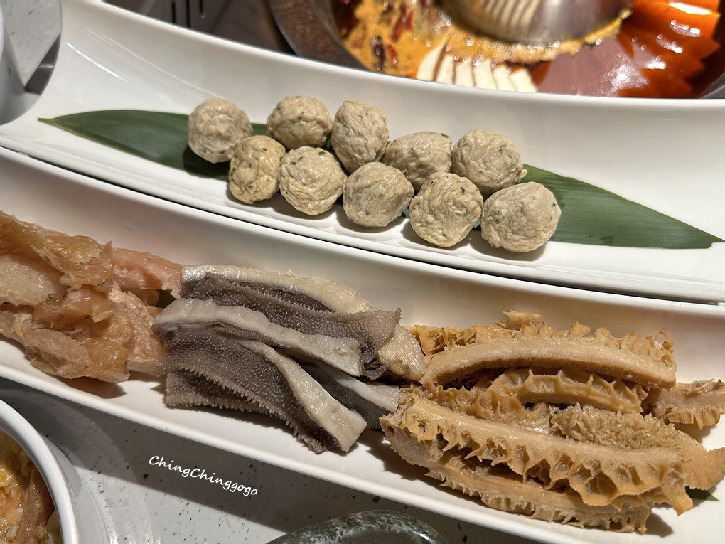 🔻牛三寶 (350元),有蜂巢牛肚、Q彈牛筋、毛肚條,牛肚吸附了麻辣湯底精華,帶著些許韌性,一咬下去彈牙又爽脆,辣勁和麻辣香在齒間爆開,牛筋則是另一番享受,經過燉煮後的膠質口感軟糯又不失嚼感,彷彿在嘴裡慢慢化開,帶著滲透到骨子裡的香辣與微微麻意,而毛肚條則在火鍋中煮得剛剛好,飄著濃厚的肉香,吃入嘴的每一口都相當入味下飯,在辣湯與乾碟的雙重洗禮下,變得溫潤又有深度!