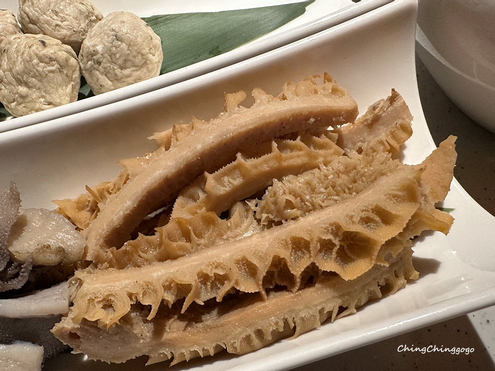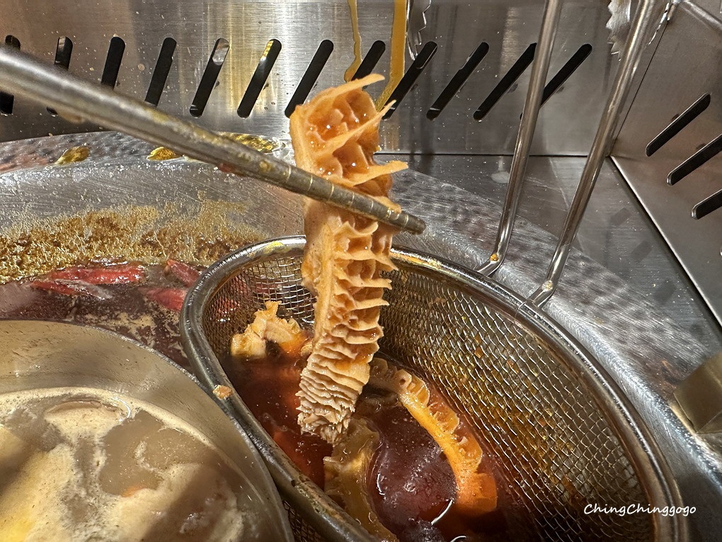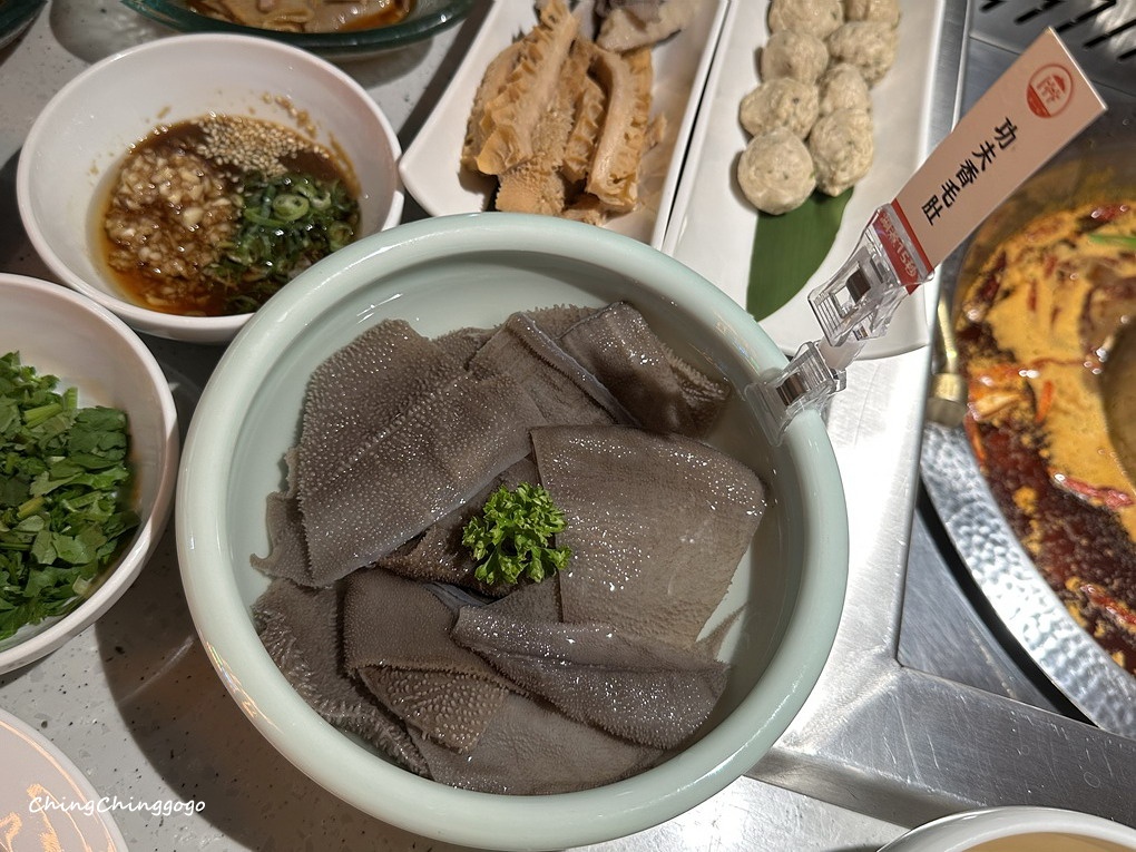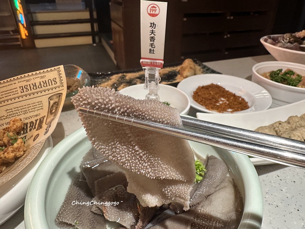 🔻功夫香毛肚 (130元),絕對是麻辣鍋裡的經典必點,七上八下15秒涮到完美熟度,讓毛肚的彈性與爽脆達到極致,入口時毛肚那特有的脆韌口感立刻襲來,咬下去有種「啪滋」的爽快聲響,彷彿口中跳動的小火花,帶著微微的嚼竟卻不失柔韌,讓人越嚼越過癮啊~~~