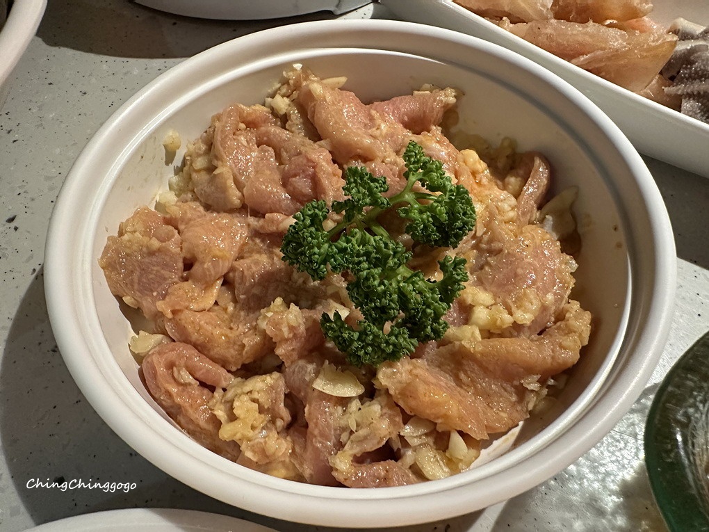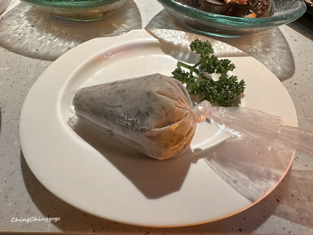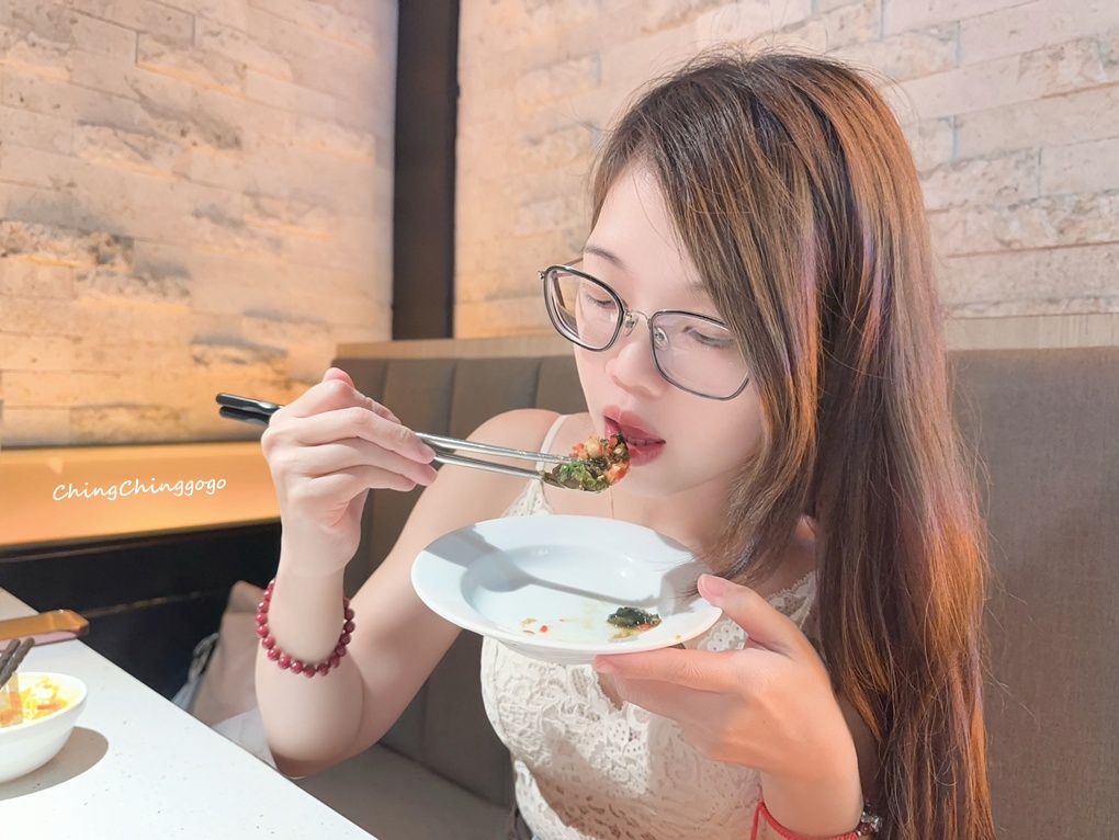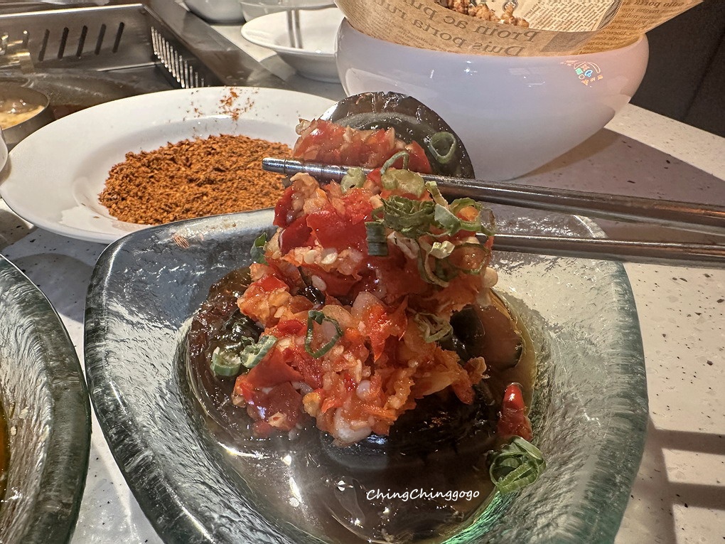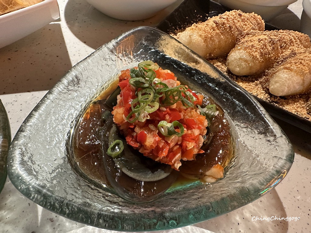 🔻涼拌蒜辣皮蛋 (105元),食用前先拌勻,夾起入口的瞬間,冰涼的皮蛋帶著晶瑩剔透的光澤,滑順的像是舌尖上「咕溜」一聲滑過,完全沒有惱人的腥味,咀嚼時皮蛋特有的Q彈膠質感,慢慢釋放出濃郁蛋香和蒜泥的嗆香、醬汁的微麻辣在口中交織,刺激卻不厚重,尾韻留下一抹清爽的香麻感,既解膩又開胃,晴晴兒吃最多XD