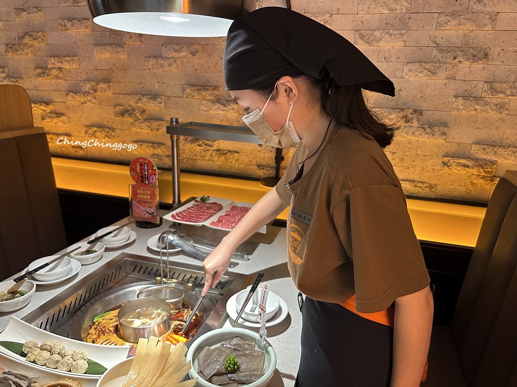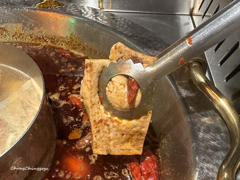 麻辣鍋微微開始煮滾後,服務人員會來桌服拿夾均勻撥開食材,等待滾沸直至麻辣鴨血、鮮豆腐、大黑豆干等料煮入味。