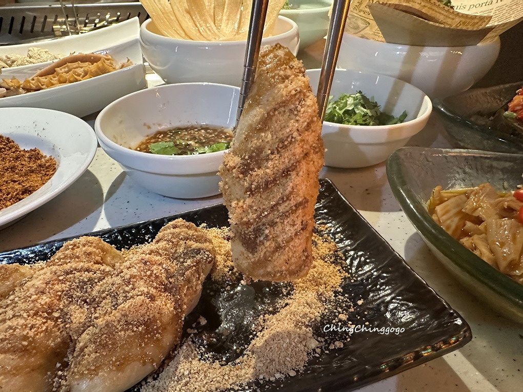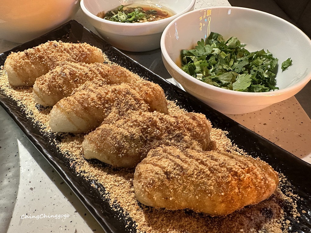 🔻手工紅糖糍粑 (80元),幾塊金黃酥亮糍粑整齊排列,外皮炸得微微酥脆,撒上一層細致的花生粉,還緩緩淋上糖漿,咬下去第一口,外酥內糯的口感瞬間爆發,外層微微酥脆,像剛起鍋的一層薄殼,裡面則是黏糯柔軟的糯米糰,Q彈中帶著微黏性,每口像是在嚼一團甜蜜的雲朵,好幸福~