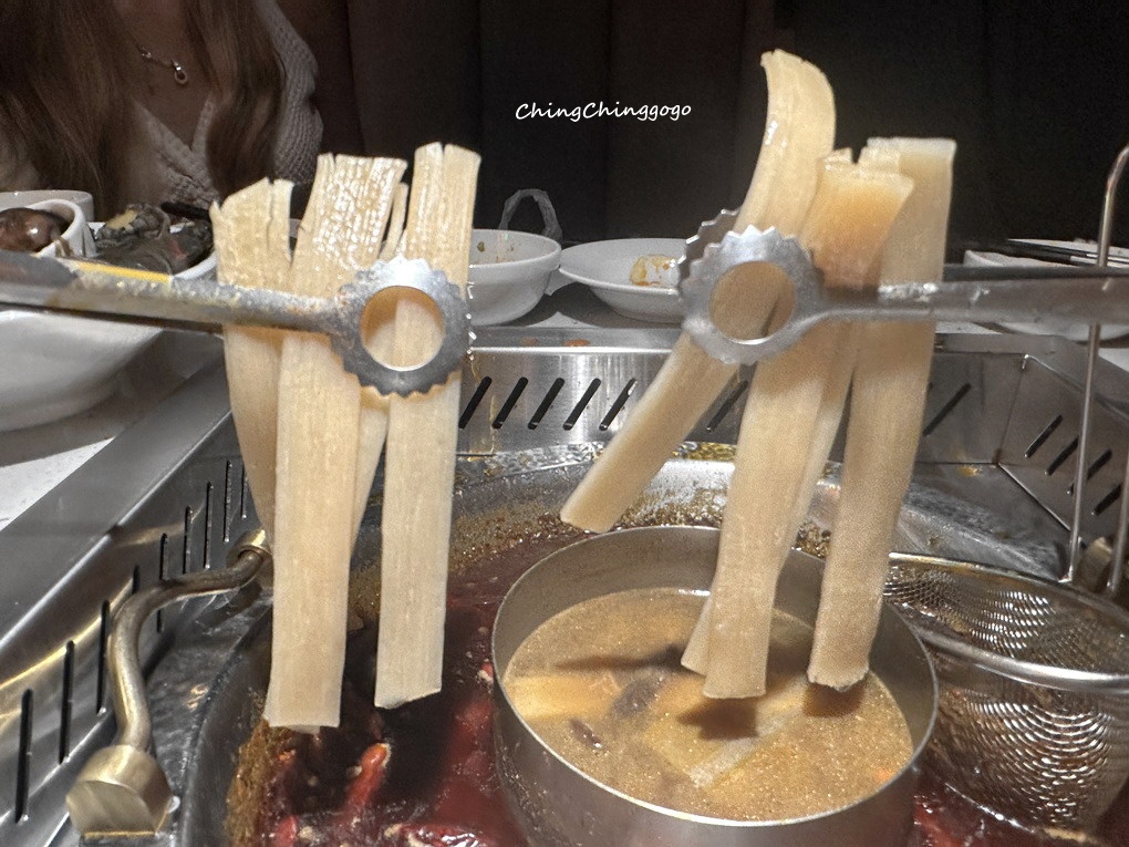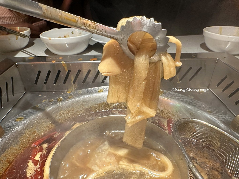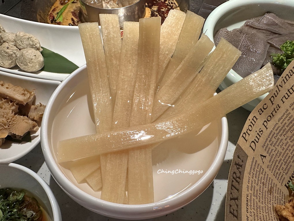 🔻QQ川粉 (100元),一條條堅硬的川粉,放入鍋內煮幾分立即撈起,滑順中帶著明顯的彈潤感,咀嚼感受到粉條在齒間彈跳,吸附滿滿麻辣湯汁後,川粉的本身清淡被完全喚醒,鮮香、麻勁與辣味一同釋放,滑Q勁道層次分明!