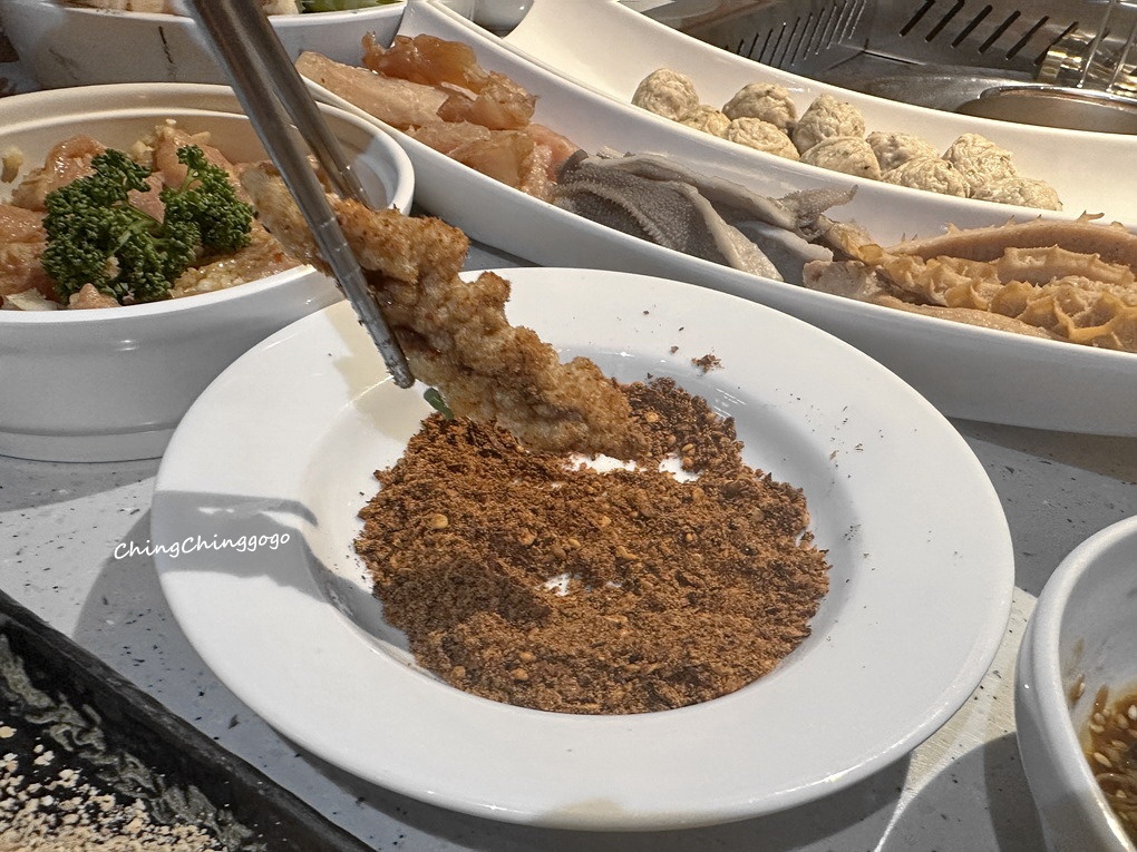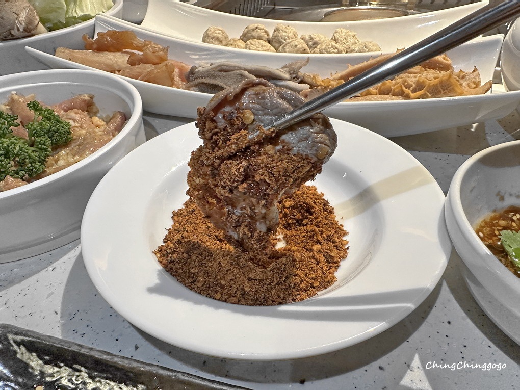 🌶️麻辣乾碟 (10元):從麻辣紅湯中撈起的肉片,迅速裹上一層麻辣乾碟,一入口先是乾碟中辣椒粉的香氣猛然炸開,緊接著席捲整個舌尖,酥麻中帶著顆顆芝麻的香脆,香氣濃烈而不失層次哦~