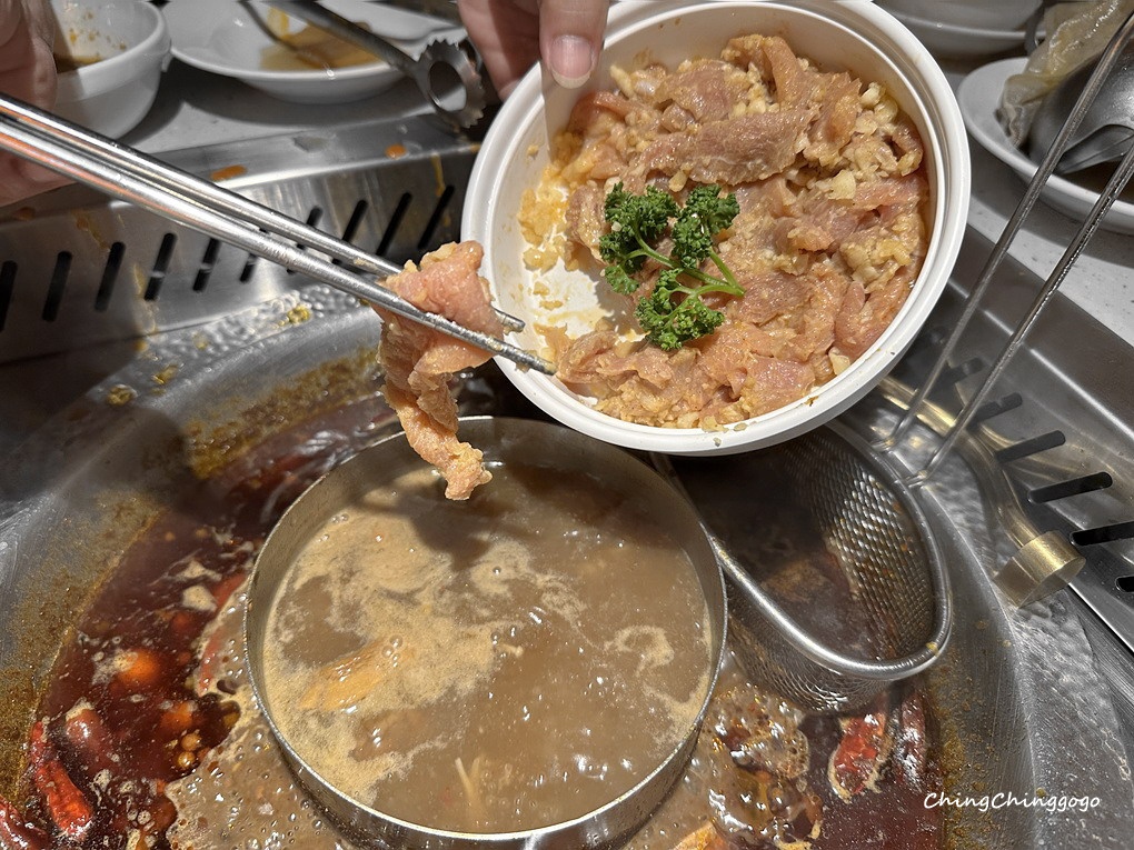 🔻蒜香爽嫩豬 (160元),一吃入口中,先被那股蒜香撲鼻而來,帶點溫潤卻不嗆辣的氣息,瞬間挑動食慾,肉片入口滑嫩,厚薄適中,嚼起來帶點彈性,肉質細緻卻不柴口,肉汁慢慢溢出,融合蒜香的濃郁和麻辣湯底的清麻,在舌尖交錯出一種鮮香麻層次哦~