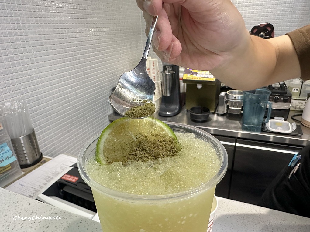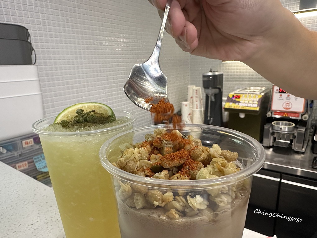 翡翠檸檬冰沙倒入杯中,接著撒上獨門「麻香元素~」,香氣十足的青花椒粉裝飾,最後再放上青花椒粒點綴。 第二杯阿華田加入甜蜜脆果,再佐以特製辣椒粉增添風味,酸甜麻、香甜辣,是滋味獨特的體驗!