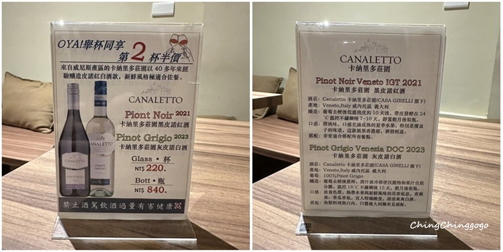 OYA!舉杯同享,第二杯半價!來自威尼斯卡納里多莊園,40年釀造經驗的皮諾紅白酒,鮮活風味佐餐首選,有興趣的客人可以試試~