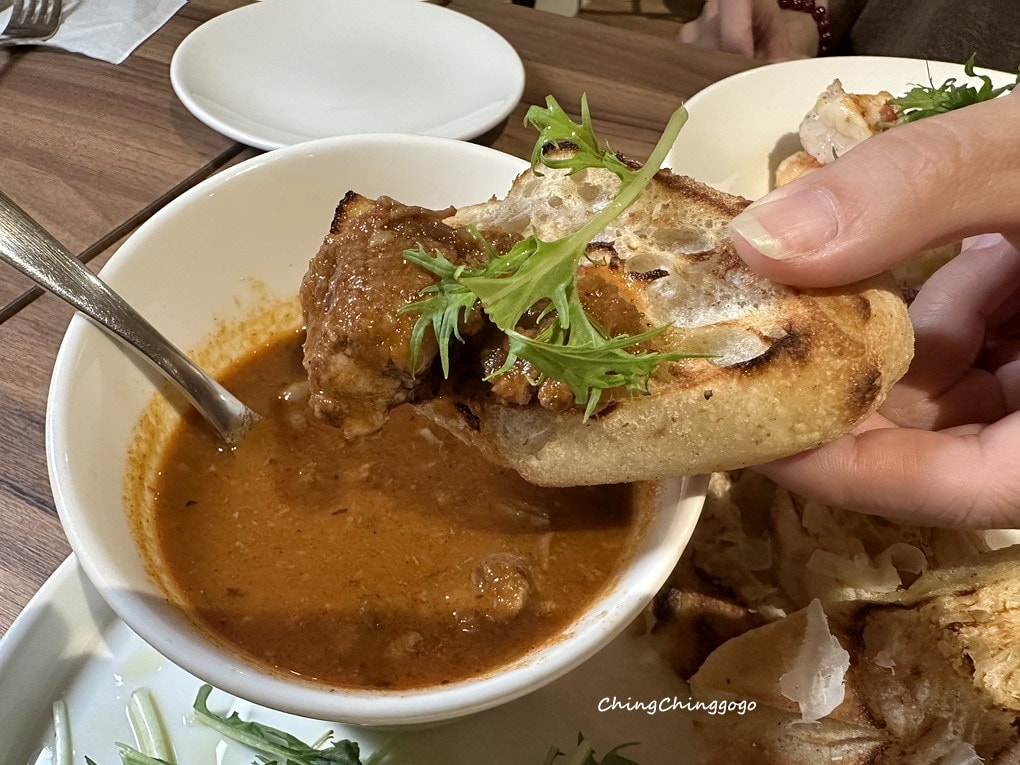 拿起酥脆脆的窯烤麵包,吸附醬汁更添風味,佐以新鮮芝麻葉生菜,清爽平衡整體口感。