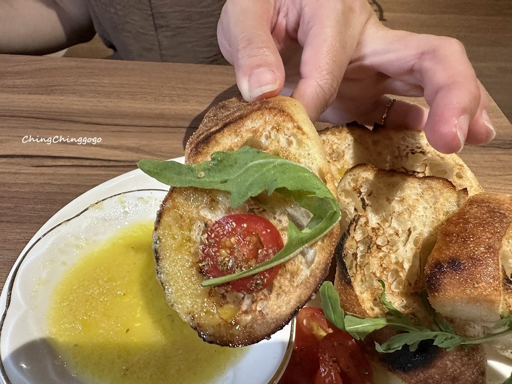開胃麵包外酥內嫩,夾上芝麻葉,佐鮮番茄酸甜多汁或橄欖油香醇滑順,吃入嘴中酥香帶嚼勁,層次豐富、爽口開胃。