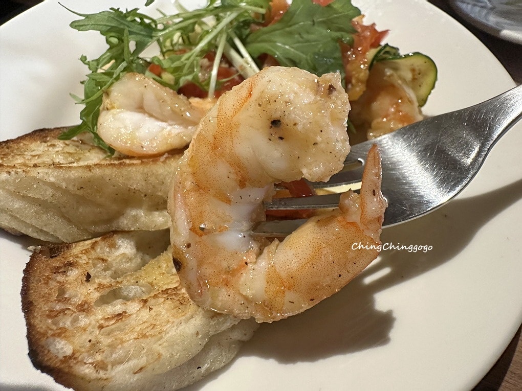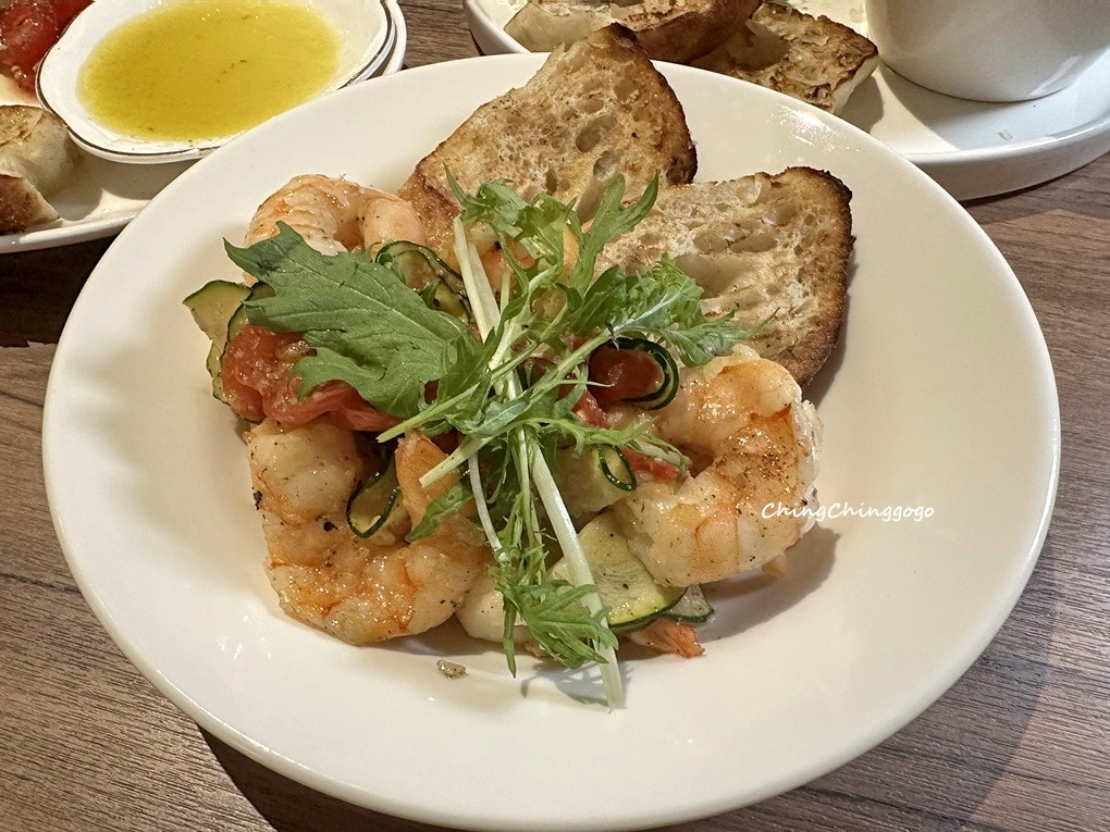 現作窯烤蒜味蝦鮮嫩彈牙,橄欖油蒜香濃郁,搭配小番茄酸甜、櫛瓜清脆,芝麻葉增添清爽辛香,口感豐富、層次鮮明哦~