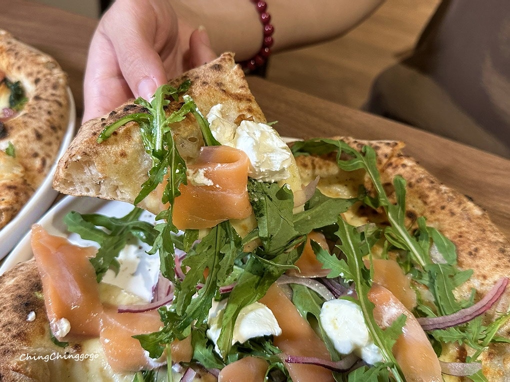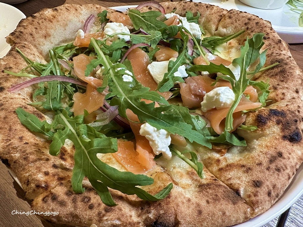 現作手工窯烤10吋白底披薩,煙燻鮭魚鹹香柔嫩,融合乳酪與馬斯卡邦的濃滑奶香,紫洋蔥微嗆爽口,芝麻葉清新平衡,清爽細緻、層次豐富,晴晴兒超愛鮭魚這味的捏~~~
