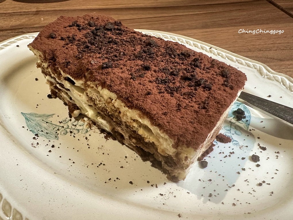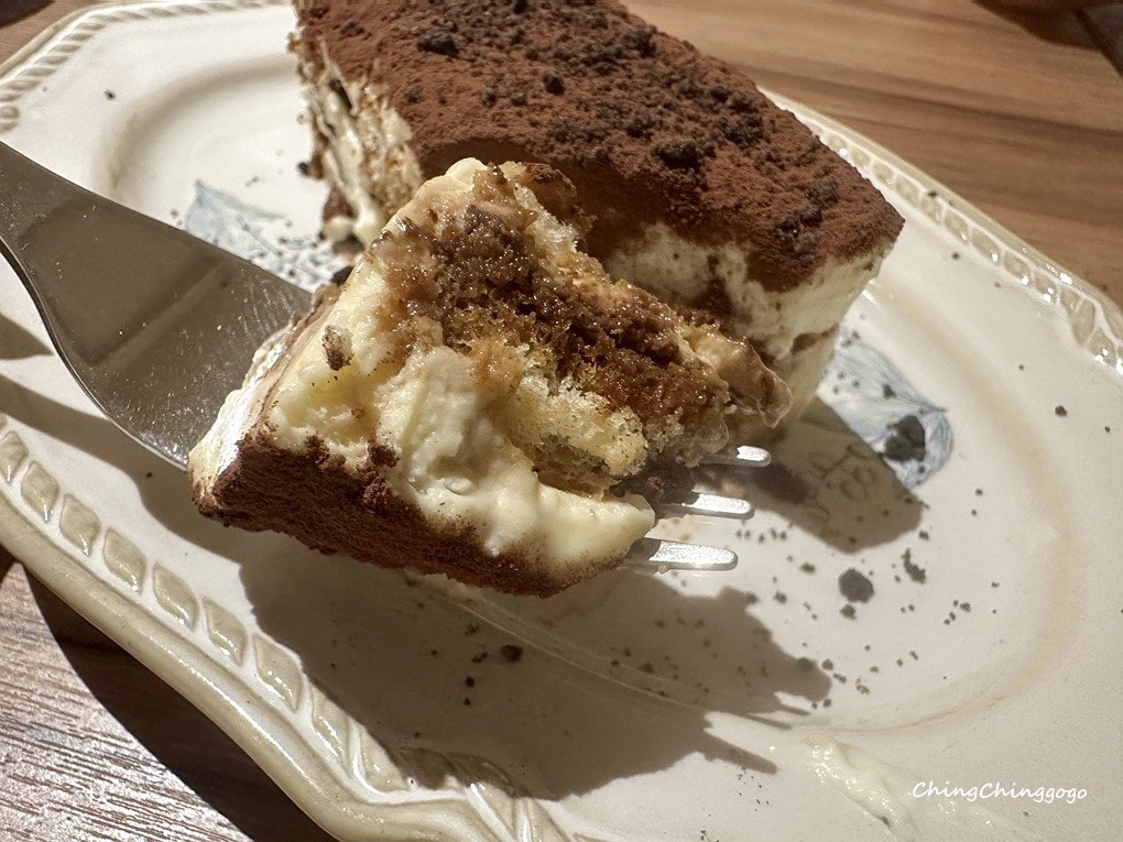 含酒精的提拉米蘇口感層次豐富,上層細緻柔滑,中層乳香濃厚,下層浸透咖啡酒的餅乾,濕潤微苦,甜中帶苦、綿密滑順,入口即化。